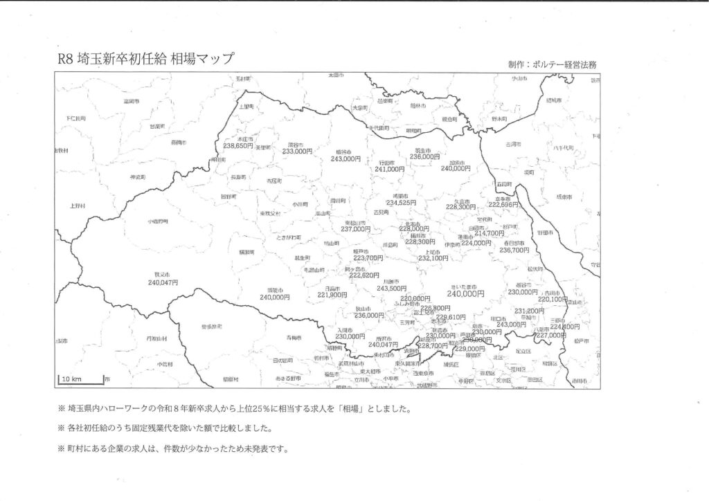 2025年8月30日 / 最終更新日時 : 2025年8月30日 porte_2016 トピックス/話題 新卒初任給マップ@埼玉 埼玉県内の市ごとの新卒初任給相場はいくらなのか? 埼玉県内ハローワークの令和8年新卒(大卒)募集の求人票を全て見て調べました。 でも、新卒を採るには中位くらいの額だと難しい。 そこで、上位25%の額を「相場」とさせていただきました。 なお、さいたま市内の各区の相場情報は、顧客限定とさせていただきます。 地図をクリックすると、別画面でご覧いただけます
